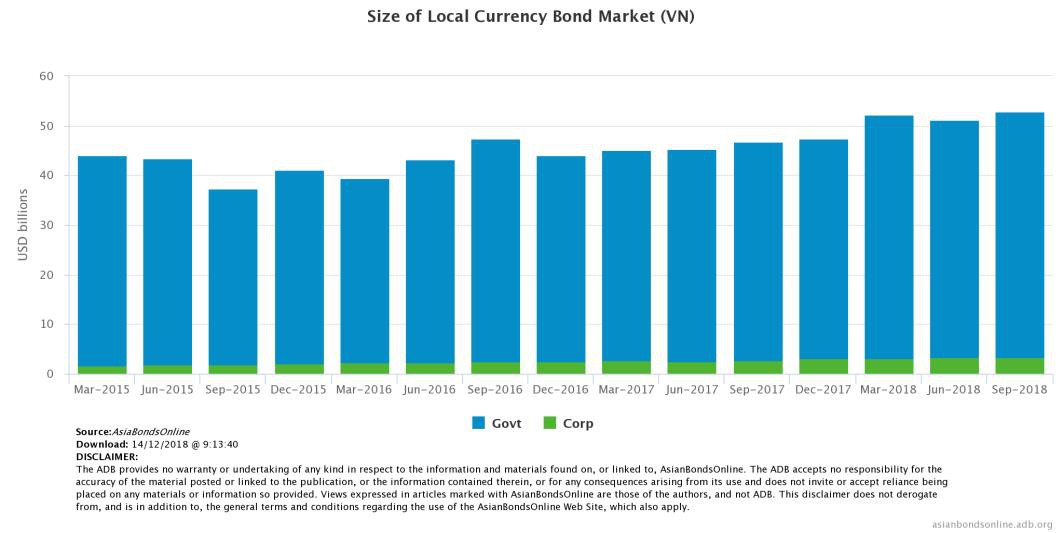 Trước hết, chúng ta cần thống kê lại quy mô của thị trường trái phiếu doanh nghiệp Việt Nam. Đến hết tháng 9/2018, tổng giá trị phát hành trái phiếu là 79.515 tỷ đồng, tăng 83% so với năm 2015 là 43.500 tỷ đồng, và tăng 32% so với cùng kỳ năm 2017, chiếm 1,48% GDP. Ở cùng thời kỳ, trái phiếu chính phủ tăng 44% so với 2015, và chỉ tăng 14,7% so với cùng kỳ năm trước, chiếm 21,5% GDP. Như vậy, quy mô và số lượng trái phiếu doanh nghiệp Việt Nam không ngừng được mở rộng hàng năm. Sự gia tăng này cũng thể hiện tính tất yếu phát triển của thị trường trái phiếu doanh nghiệp.
