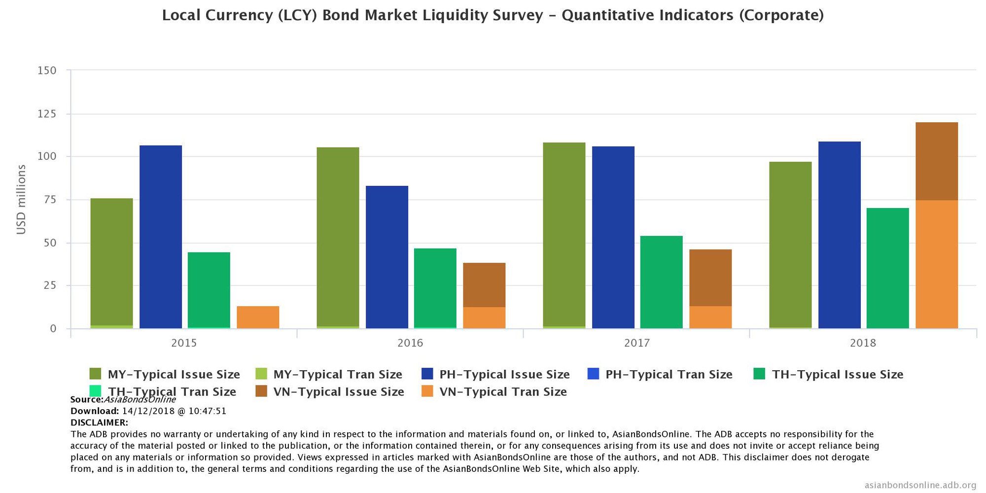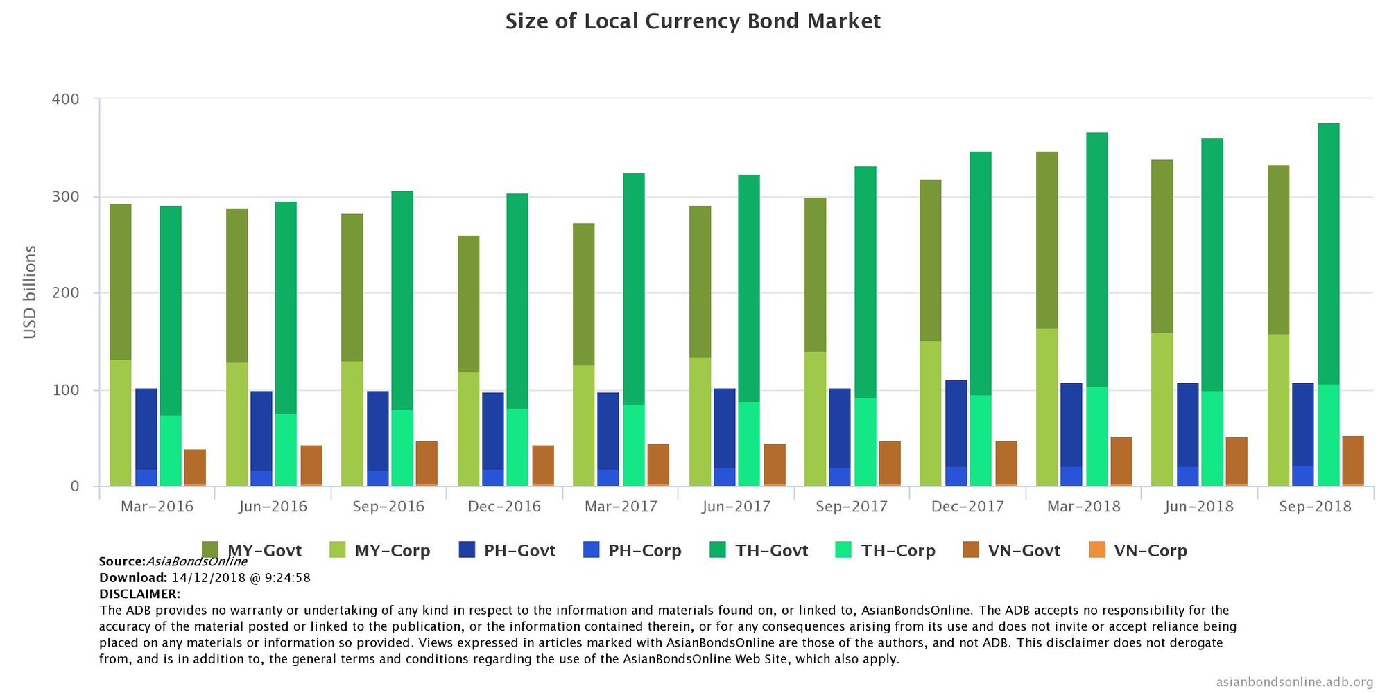 So sánh quy mô thị trường trái phiếu ở ba nước Thái Lan (TH), Philippines (PH), Malaysia (MY), và Việt Nam (VN) – Nguồn: adb.bond.online